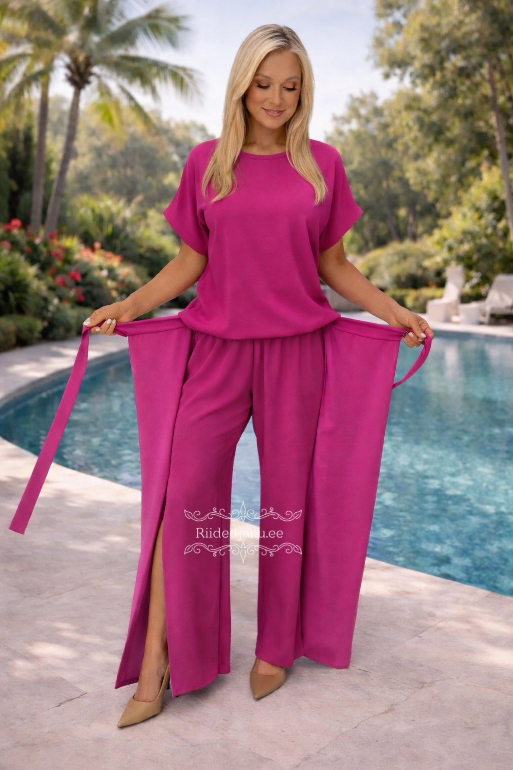 Kaunis ja mugav kaheosaline komplekt, mis koosneb vabalt langevast lühikeste varrukatega pluusist ning laiade säärtega pükstest. Püksid on elastse vöökohaga ning küljeõmblustes on efektne lõhik, mis lisab naiselikkust ja kergust. Kangas on pehme ja langeb kaunilt, sobides nii igapäevaseks kandmiseks kui ka pidulikumaks sündmuseks.