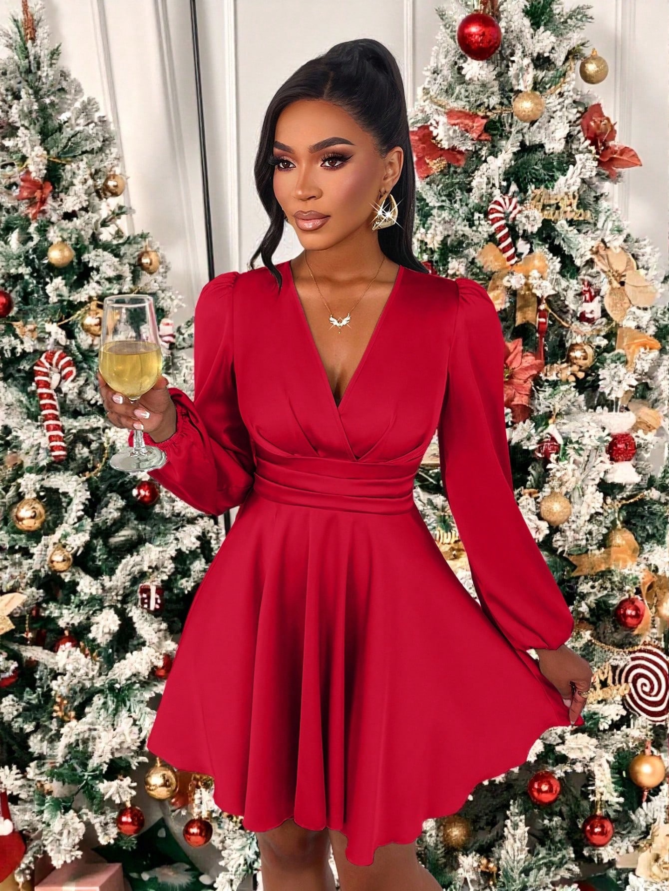 Naiselik ja pilkupüüdev punane kleit, mis sobib ideaalselt pidulikeks sündmusteks, jõuluõhtuteks ja erilisteks tähistamisteks. Sügav V-kaelus rõhutab dekolteed, taljet vormiv lõige ning kergelt langev seelik loovad kauni ja elegantse silueti. Pikad varrukad lisavad tasakaalu ja elegantsi.