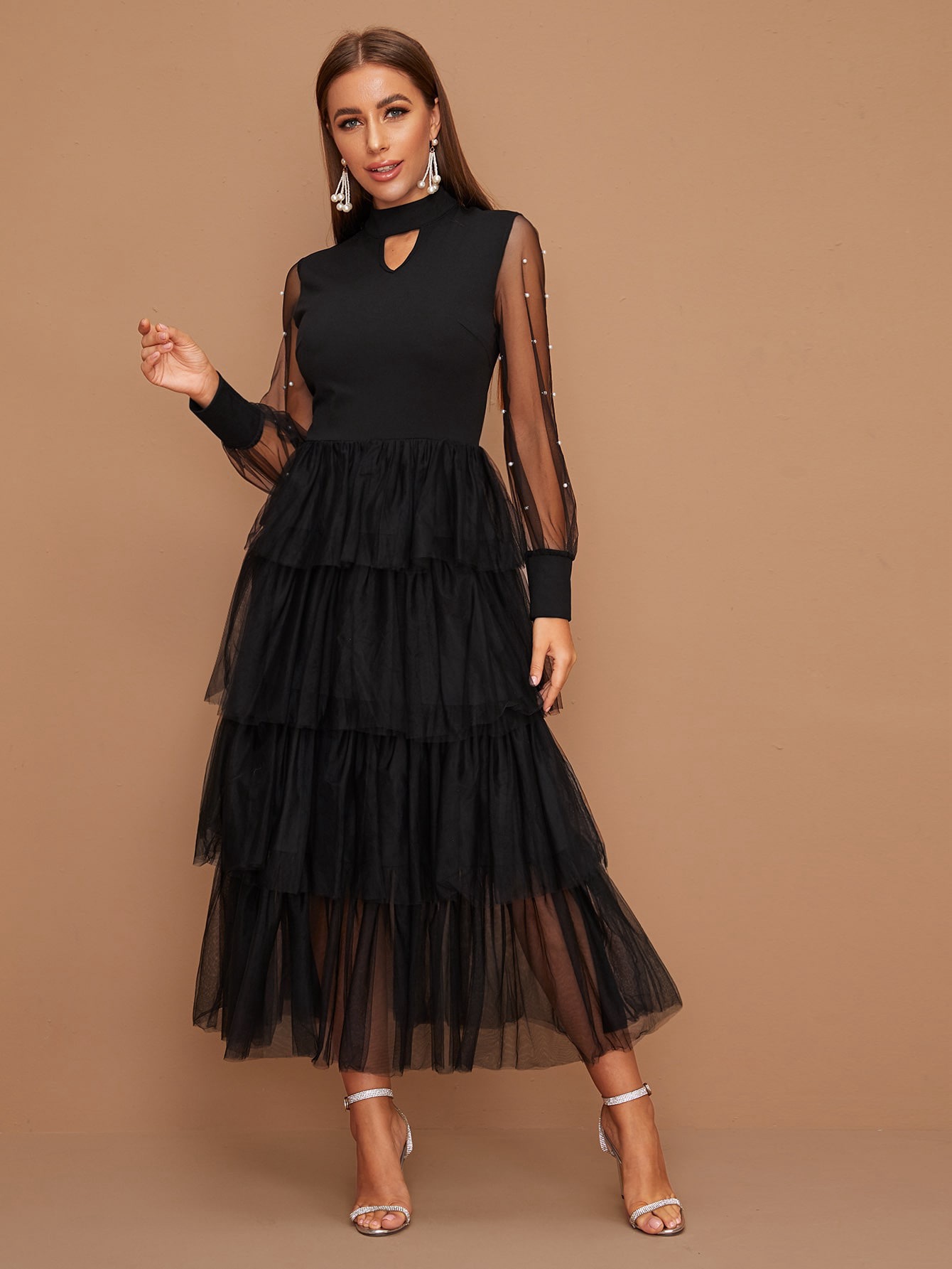 Naiselik ja elegantne must kleit, mis ühendab minimalistliku ülaosa ja mitmekihilise tüllseeliku. Läbipaistvad varrukad peente pärldetailidega ning kõrge kaelus väikese väljalõikega lisavad kleidile luksuslikku ja kaasaegset ilmet. Ideaalne valik pidulikeks sündmusteks ja erilisteks õhtuteks.