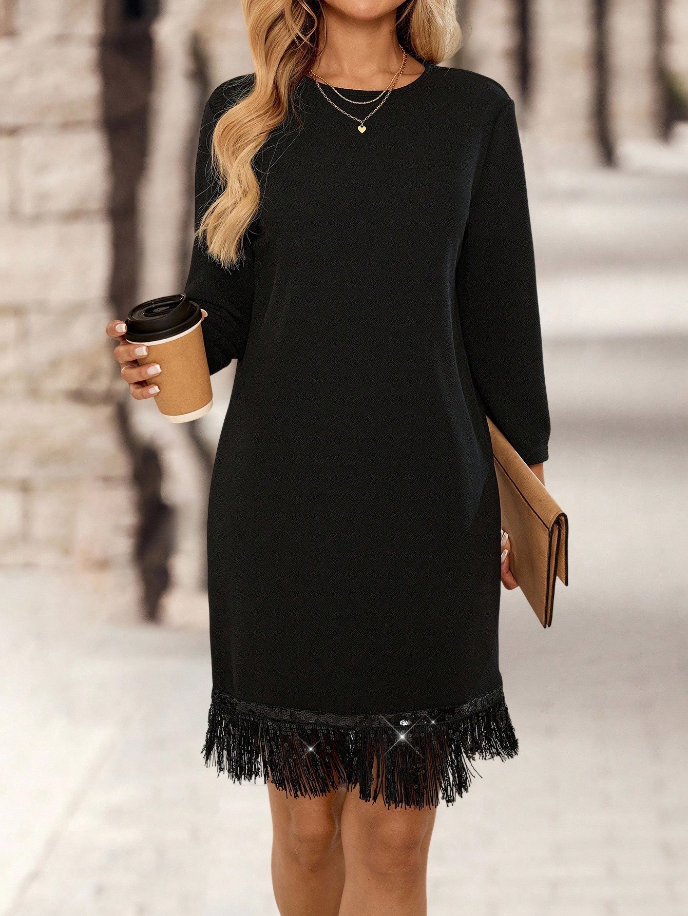 Elegantne ja mugav must kleit sirge lõikega, mida kaunistab pilkupüüdev narmastega alläär. Minimalistlik ülaosa ja efektne viimistlus loovad stiilse tasakaalu, sobides nii igapäevaseks kandmiseks kui ka õhtusteks sündmusteks.