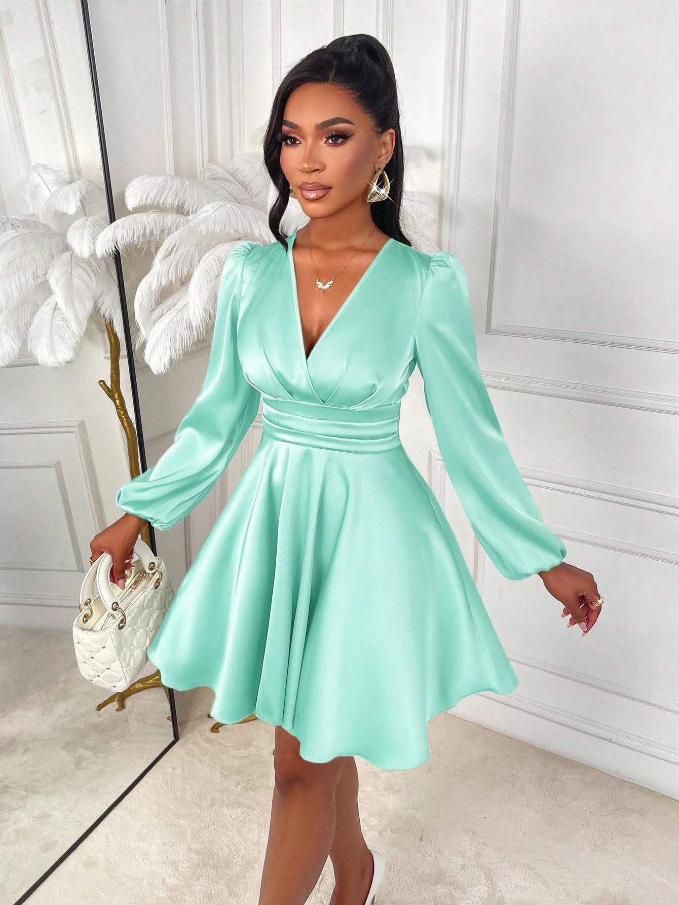 Turkiis pidulik kleit V-kaeluse ja pikkade varrukatega