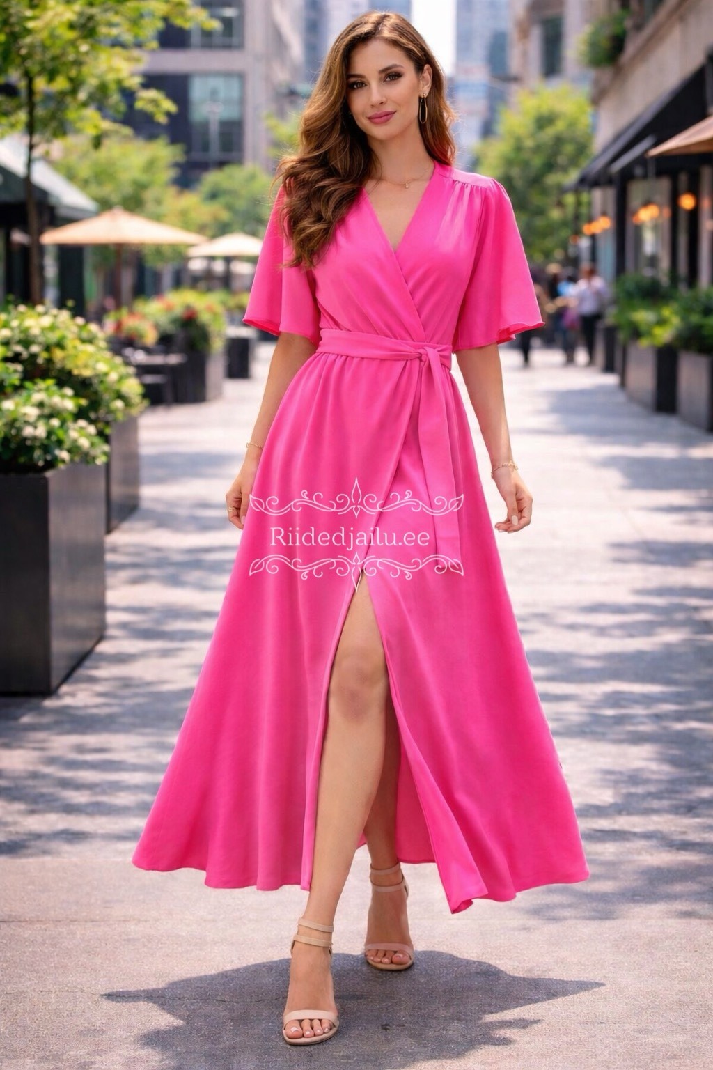 Kerge ja langev kangas, naiselik V-kaelus, taljet rõhutav vöö ning universaalne midi-pikkus – ideaalne kevadeks, suveks, pidulikeks sündmusteks ja igapäevaseks elegantsiks.